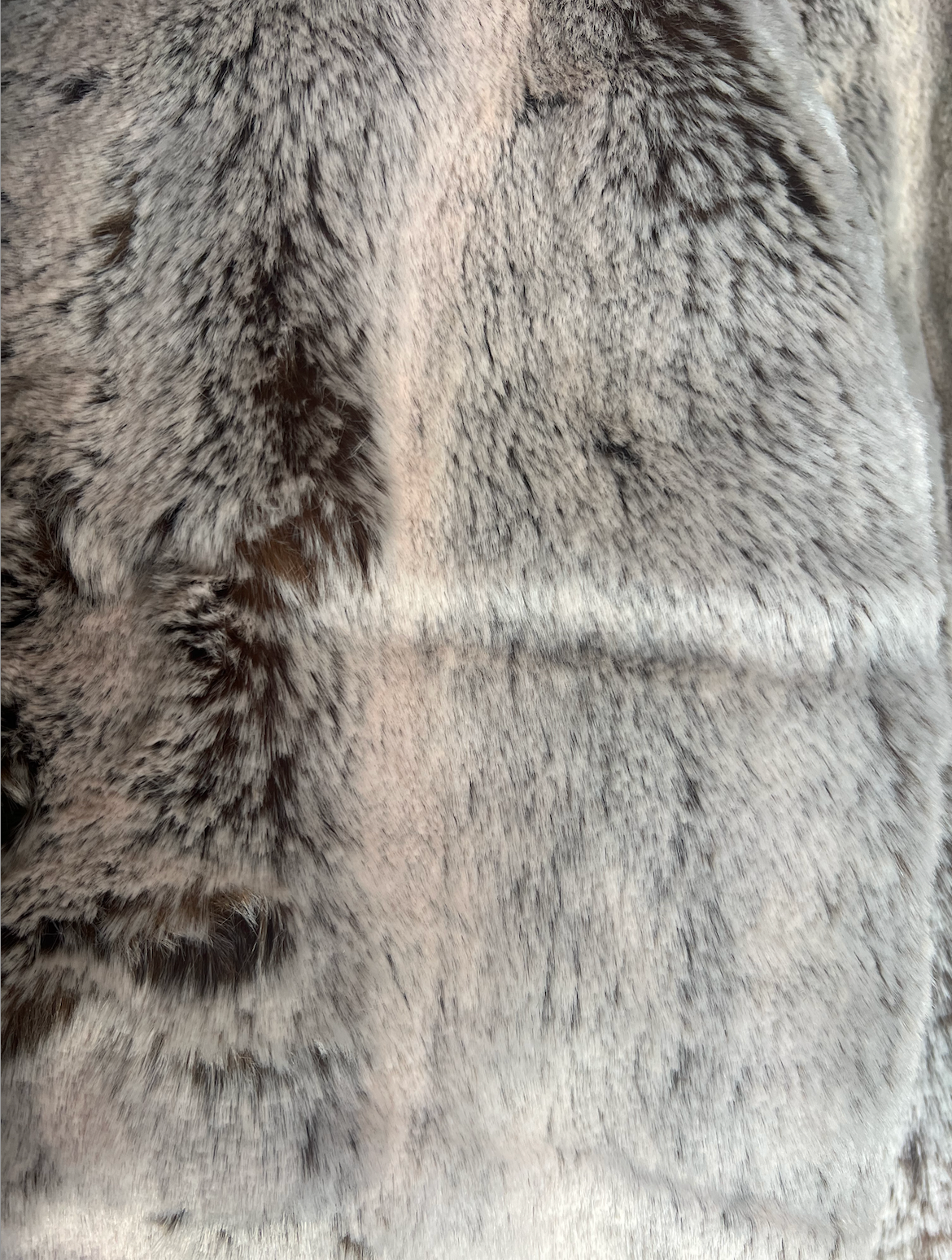Short pile chinchilla faux fur.  Soft white with brown undertones and iridescent pink peach glow on the fibers.