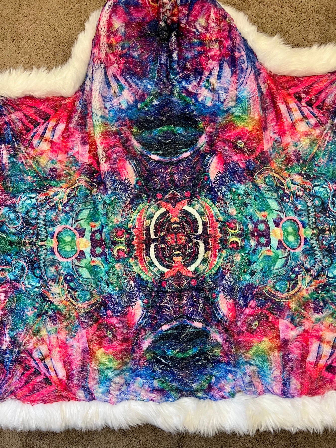 Introducing our exclusive LED hooded blanket adorned with a mesmerizing psychedelic print by Jumbie Art! This isn't just any blanket - it's a cozy haven crafted with plush luxe fabrics and an exhilarating light-up feature.