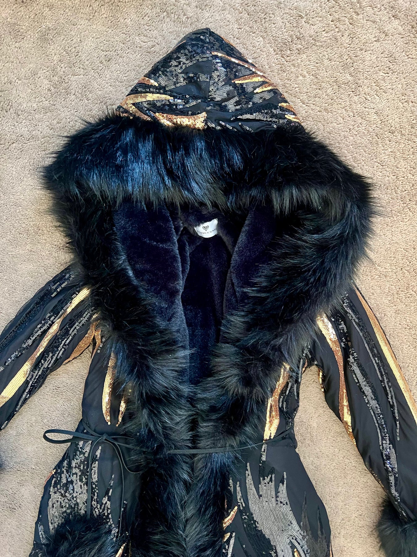 - Contrast fur trim around the sleeves, hood, and full perimeter of the coat.