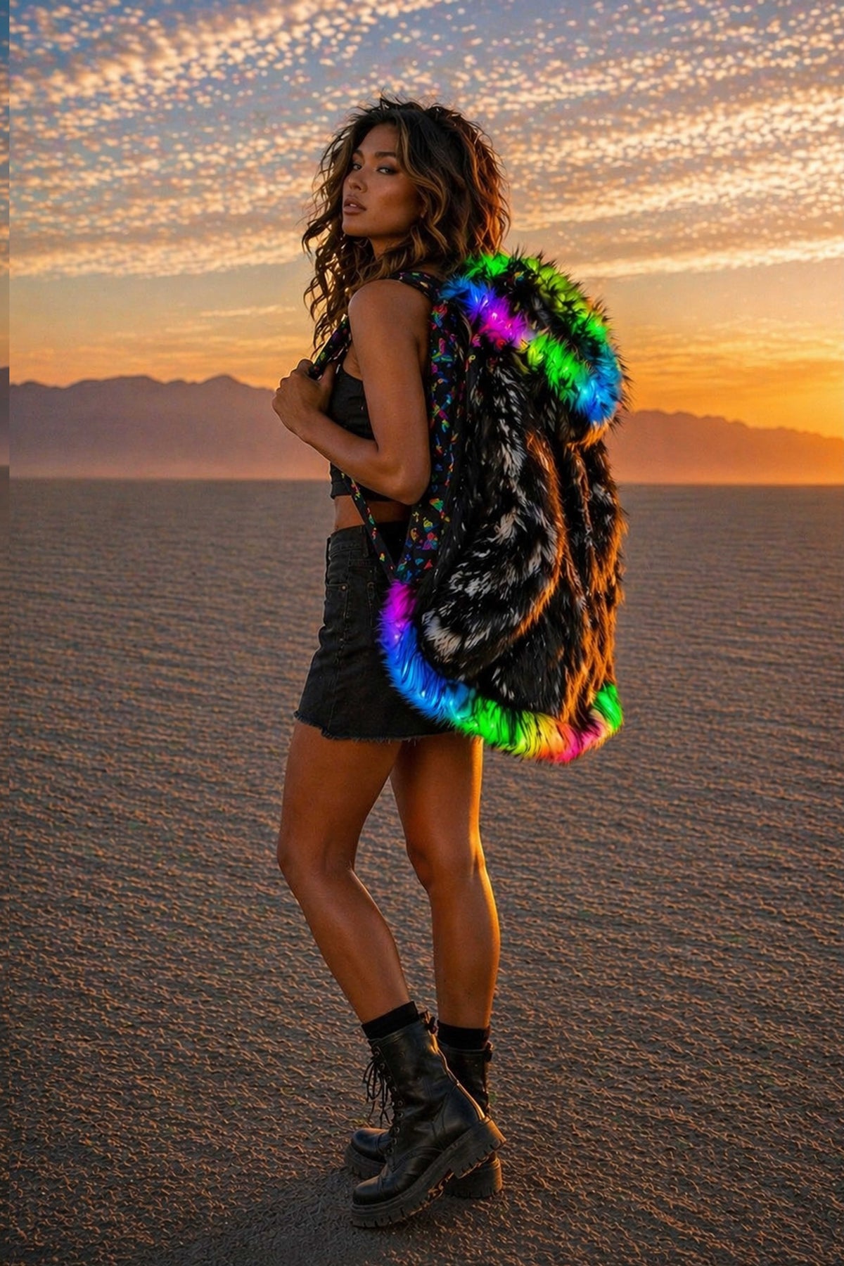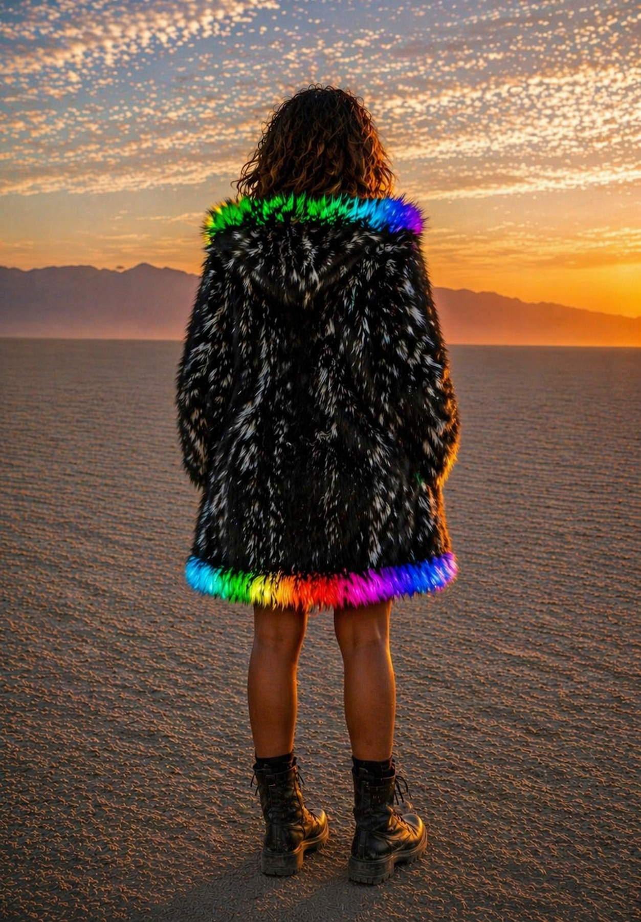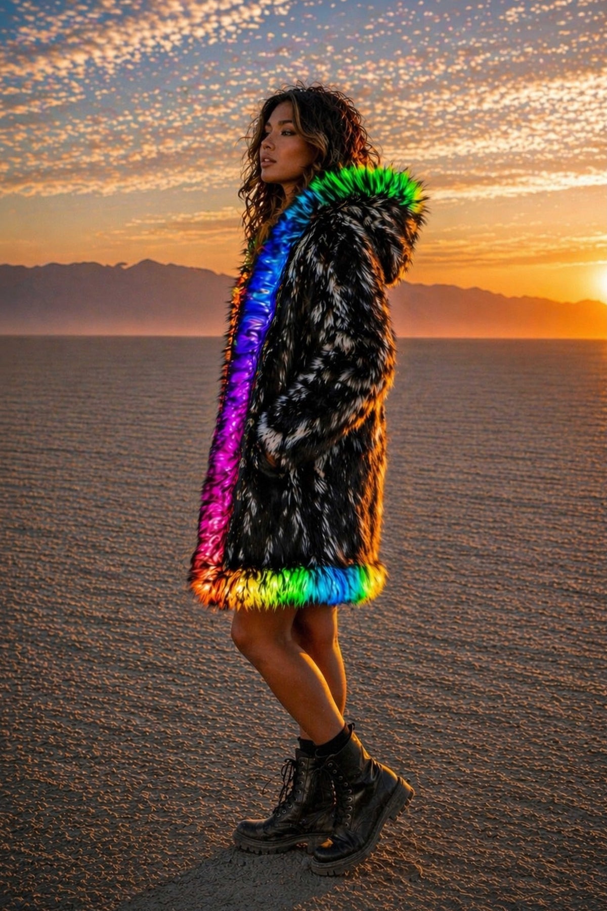 Our LED faux fur coats, vests, kimonos, hoods are proudly made to order in Los Angeles combine plush warmth with mesmerizing, seamless color-flow lighting designed to move with you through long nights and outdoor adventures. They’re safe, comfortable, and made to be worn everywhere from festivals to real life.
