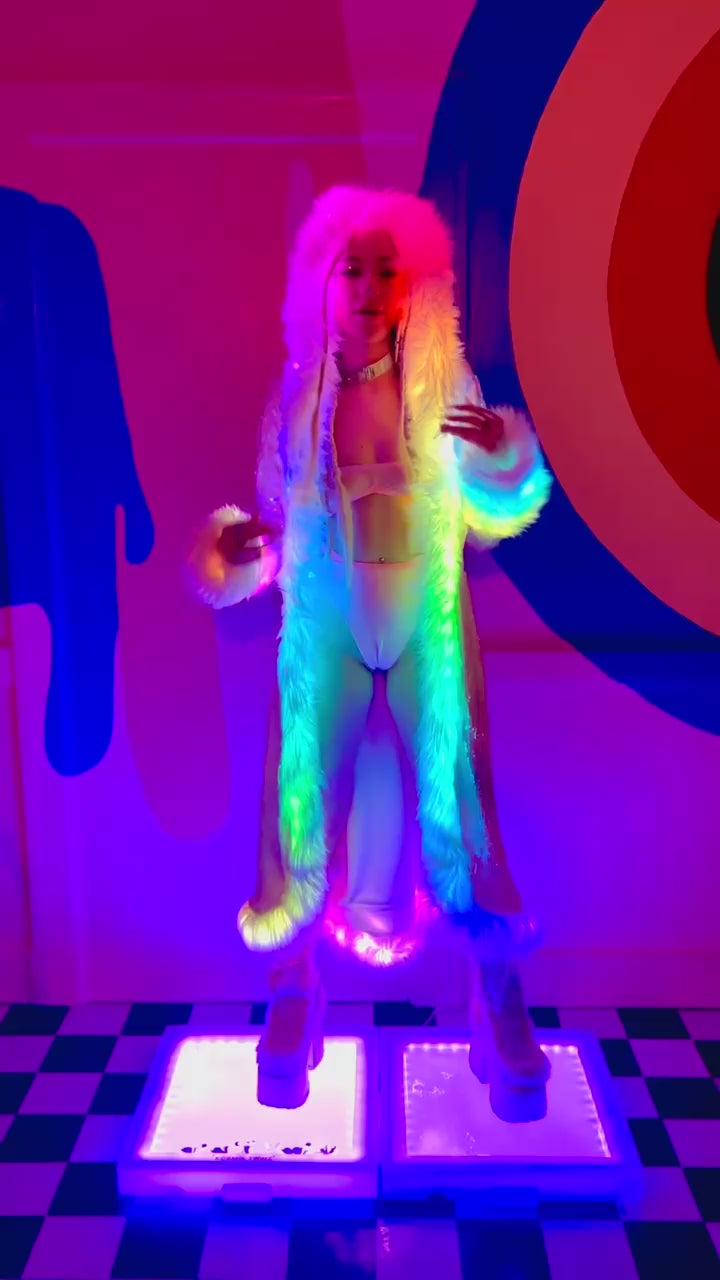 Control the LED colors patterns from your phone. This coat operates by a Blue Tooth App and has 200 color changing modes! Our custom LEDS are both durable, dry cleanable and rechargeable. Set the brightness to one notch below full bright and your LEDS will shine all through the night and into the next depending on the settings you choose!