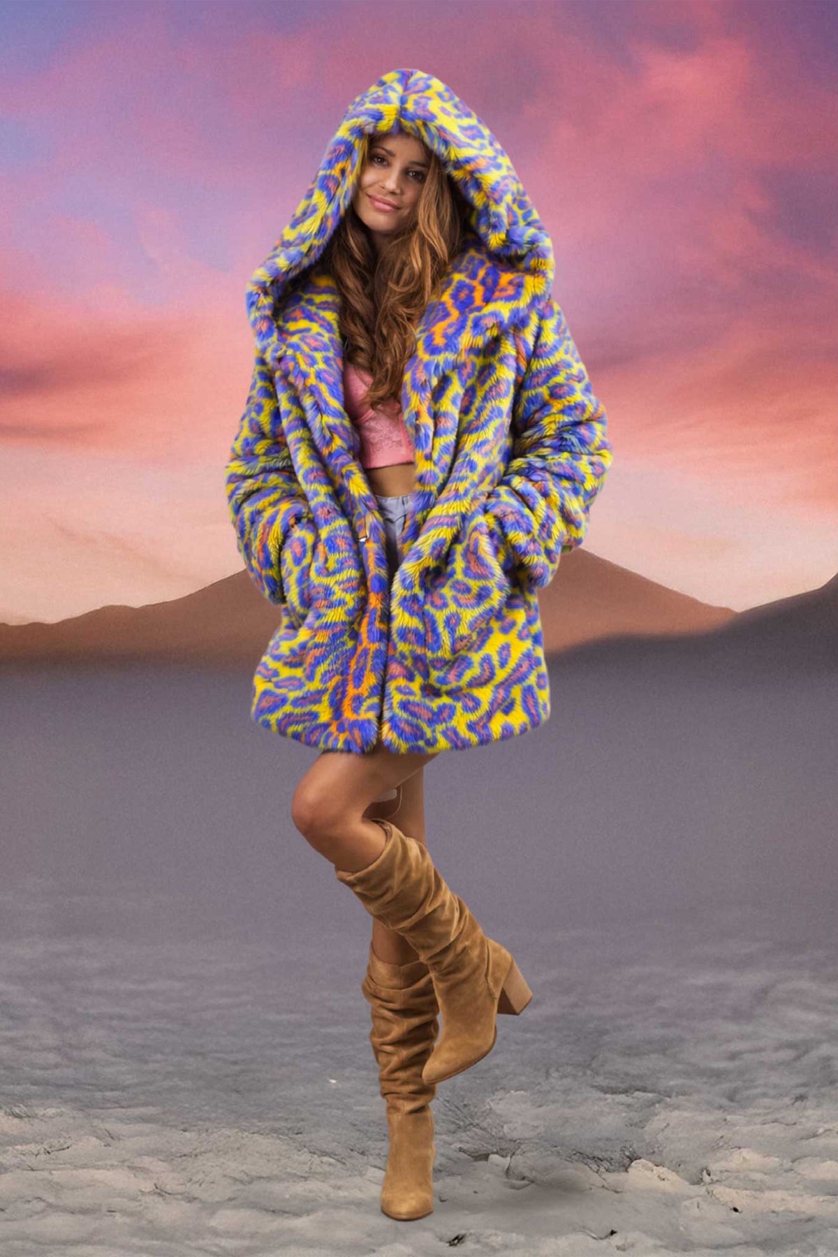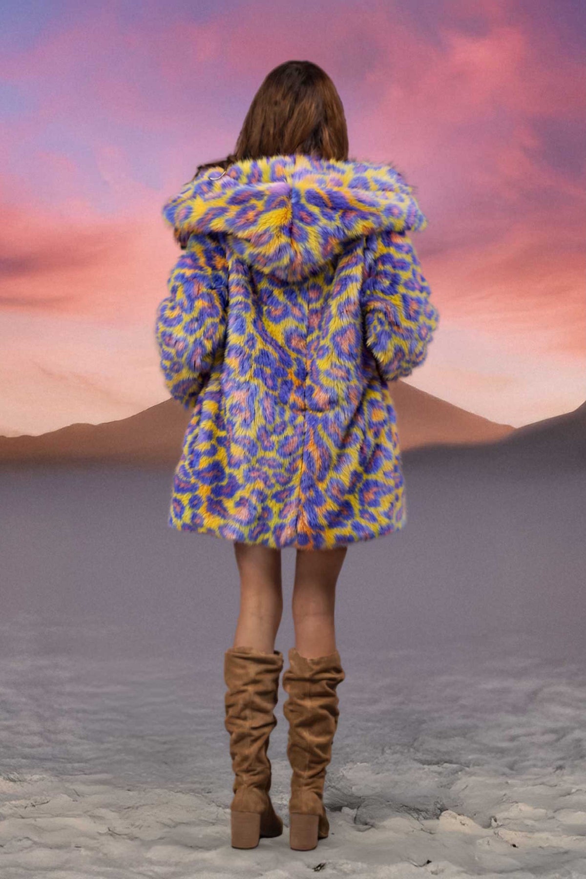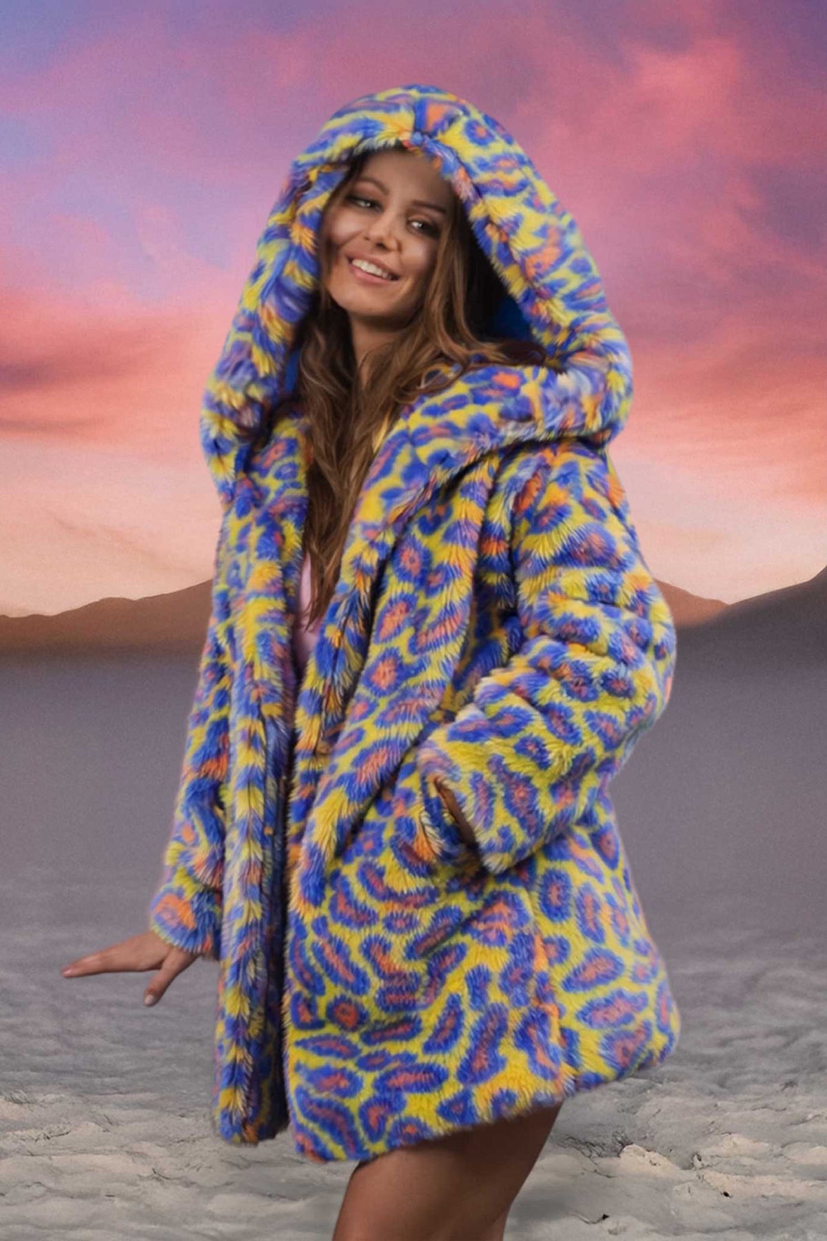The Short Desert Warrior Coat is made of the highest quality faux fur and lined with super soft cuddle minky fabric. This fur lined hooded coat is guaranteed to keep you warm and cozy on the Playa or at your next festival. This mid thigh length makes this style versatile, comfortable and easy to wear from the day to the night, from the desert to the mountains or out on the town. With 5 pockets and our signature back pack straps the Short Desert Warrior Coat is designed to be fully functional for the Playa and all your festival needs.